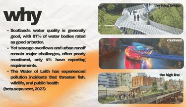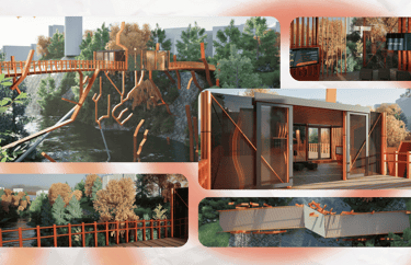 FLOW is a visionary pedestrian bridge proposal designed for the Water of Leith in Scotland, intertwining architecture, sustainability, and community engagement. Inspired by the dynamic movement of water and the crucial environmental challenges facing Scotland's rivers, the project reimagines infrastructure as both a connector and an interactive public space.